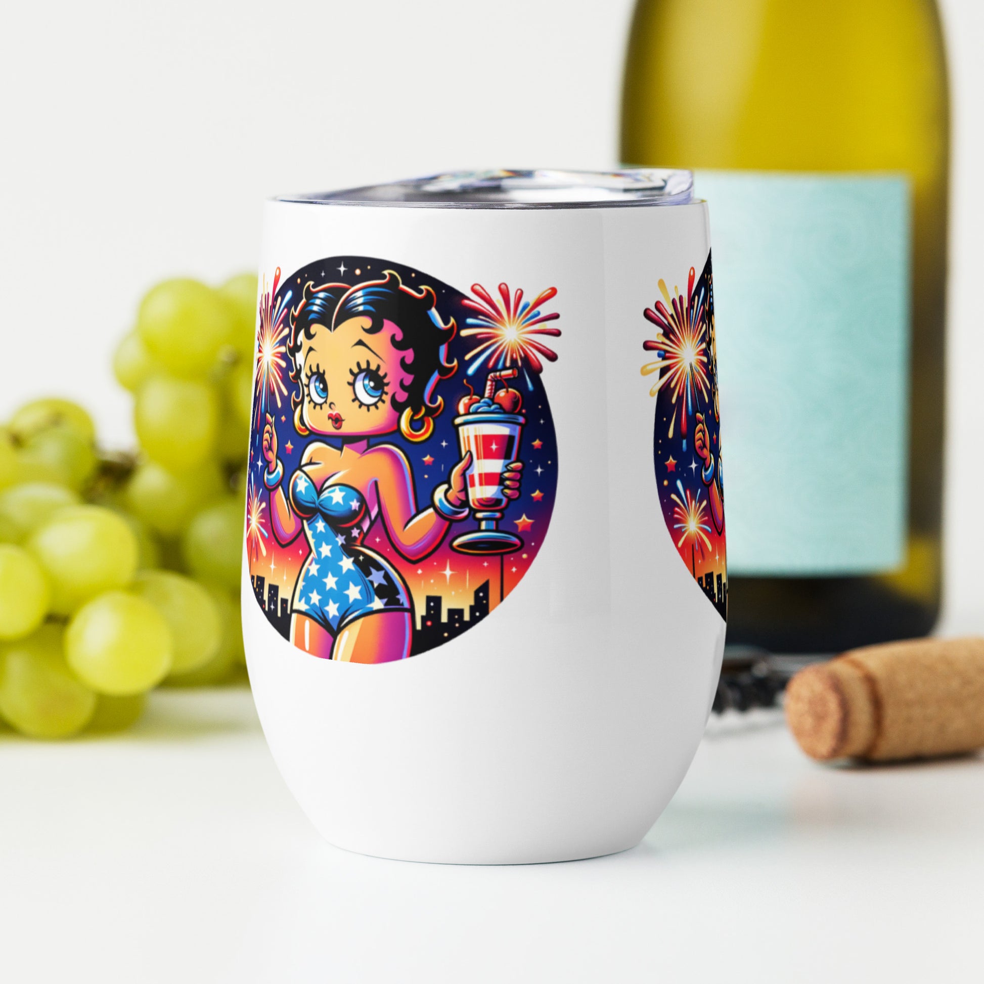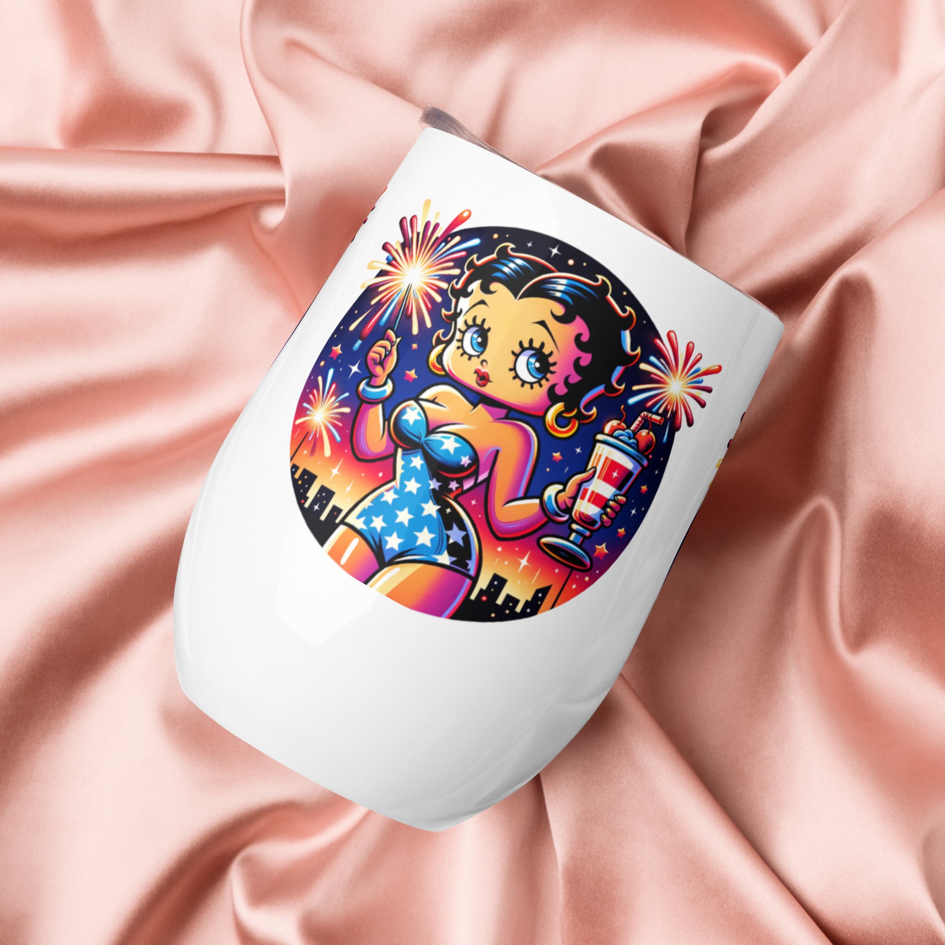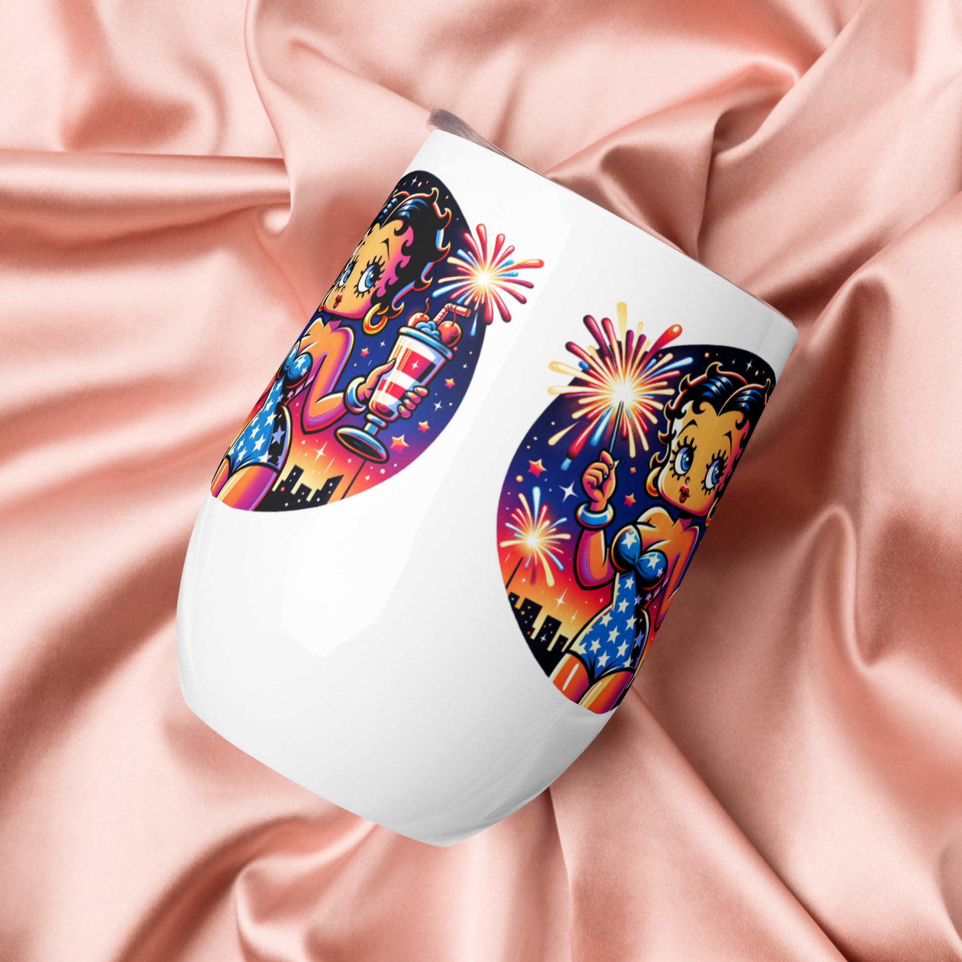 What’s an outdoor party without a wine tumbler to keep a drink fresh and at the right temperature? Forget breakable glasses—give this uniquely shaped wine tumbler a chance. Celebrate in style with this charming wine tumbler featuring Betty Boop raising a toast amidst festive fireworks. This tumbler combines vintage flair with modern fun, perfect for sipping your favorite drink, making it an ideal companion for parties, picnics, or cozy nights in. Cheers to good times with Betty Boop!