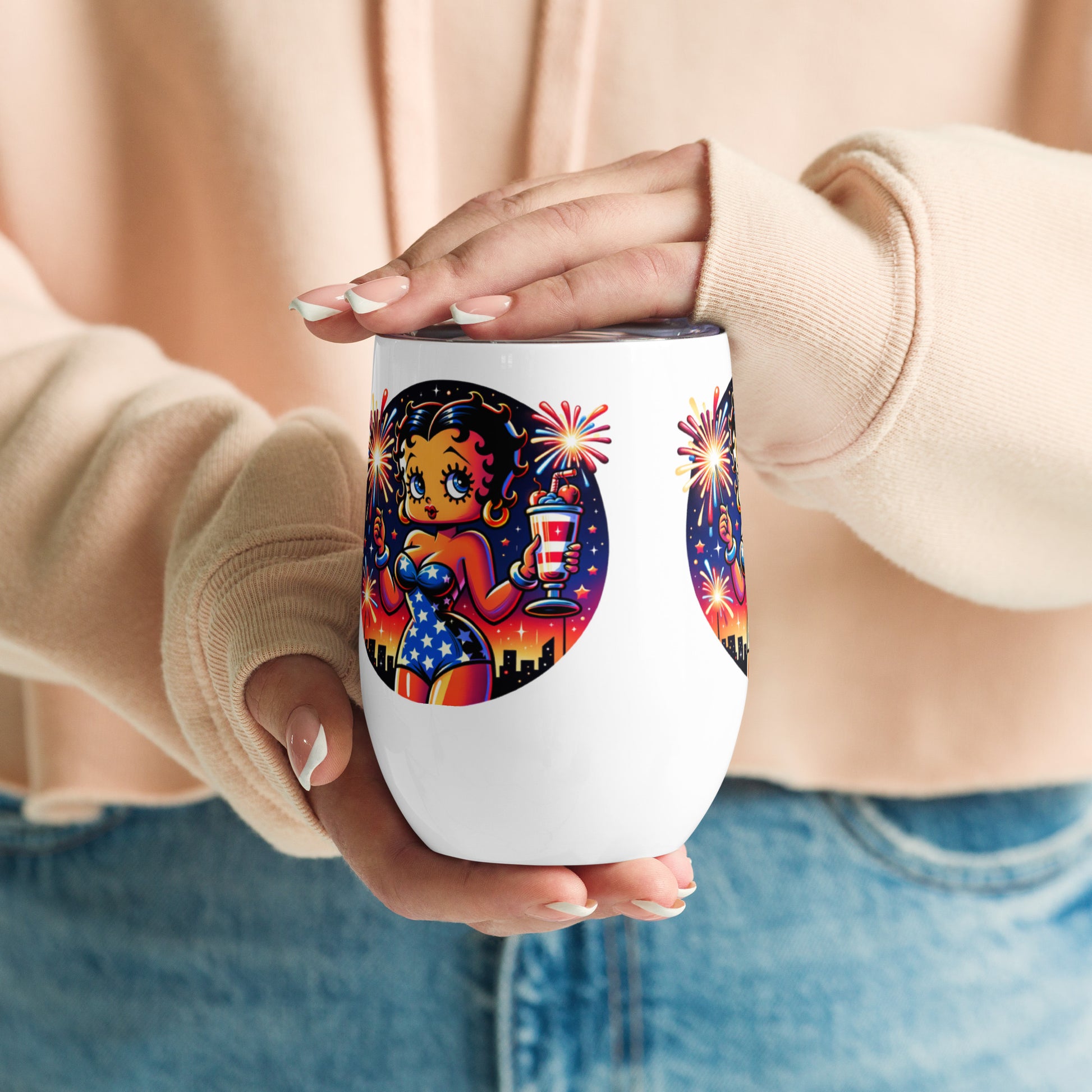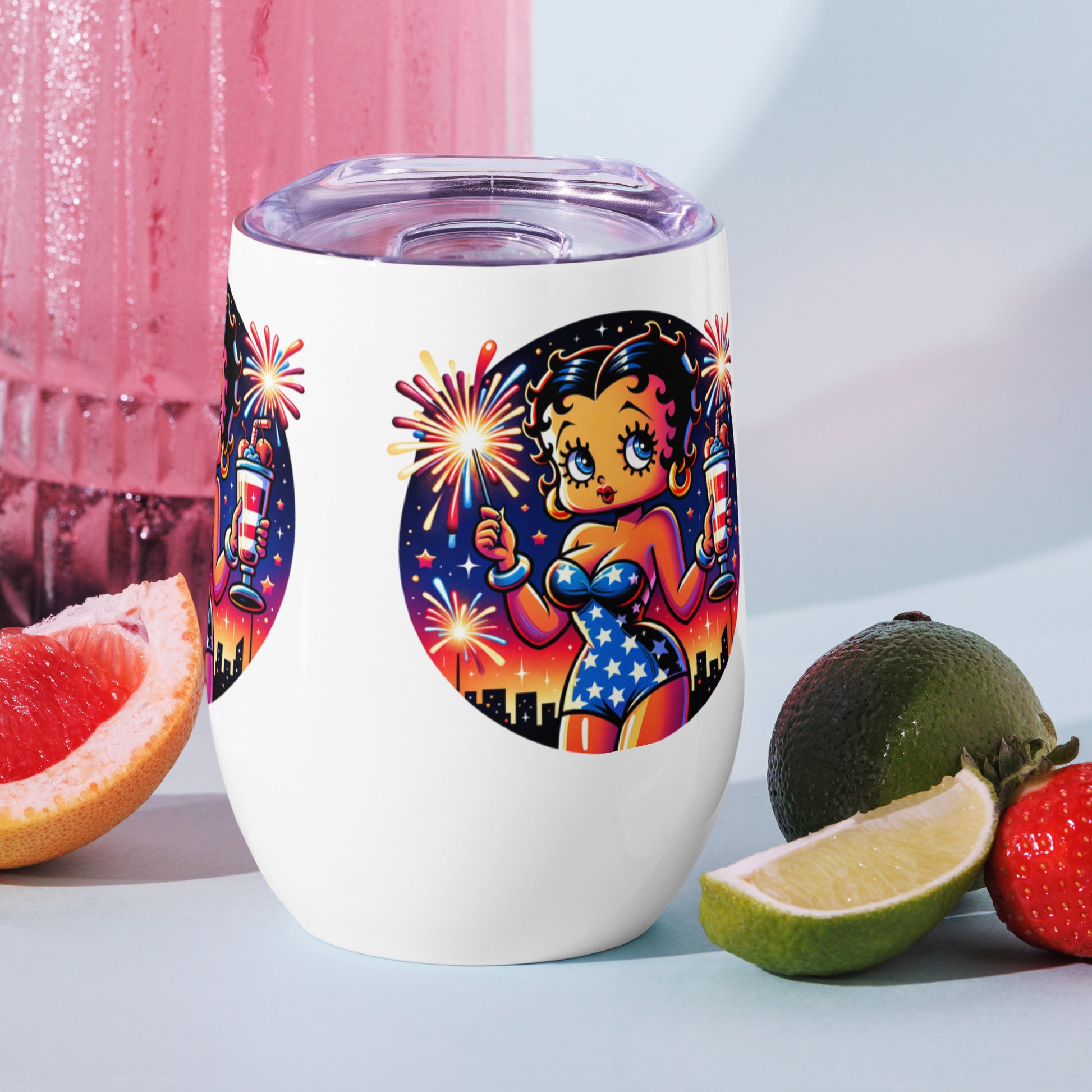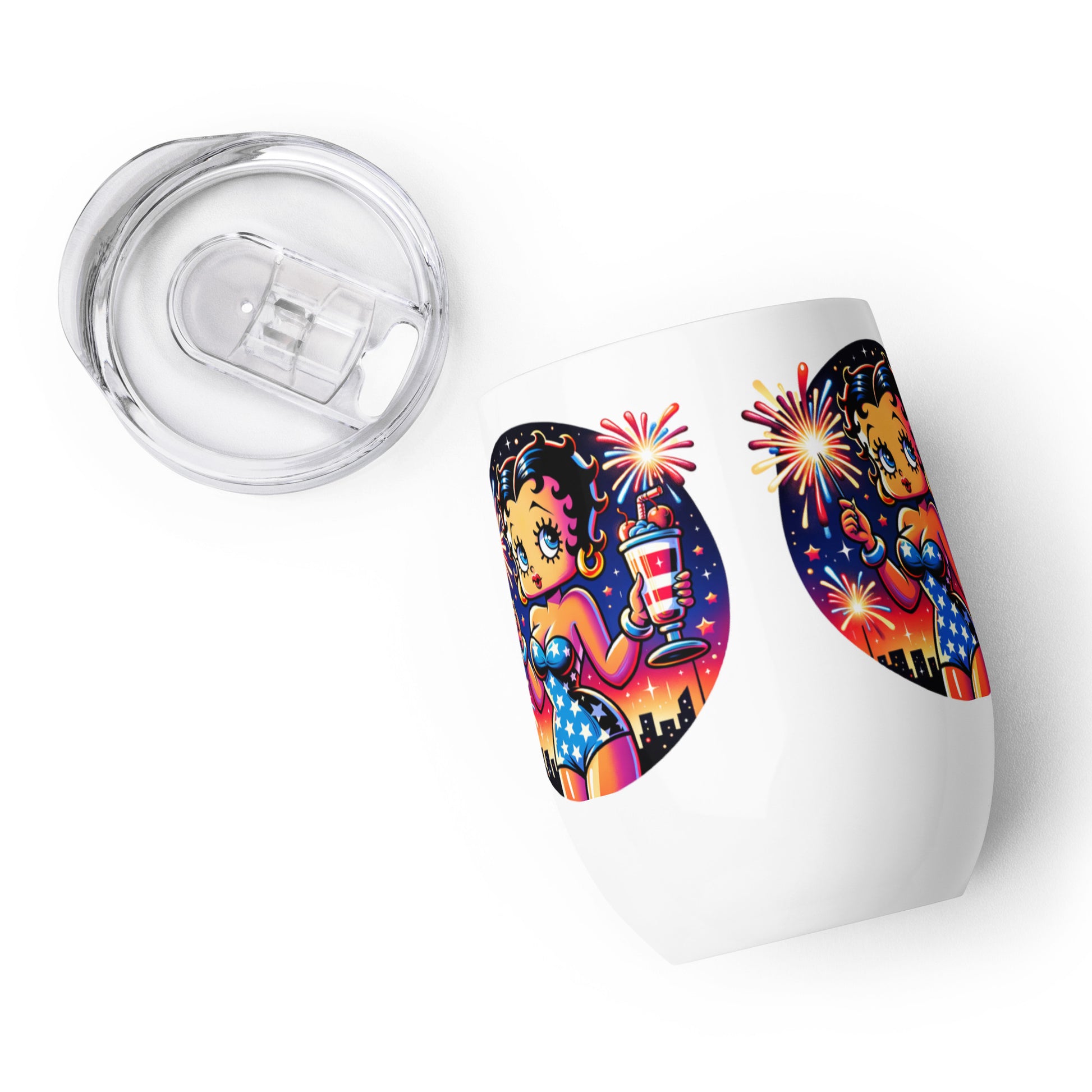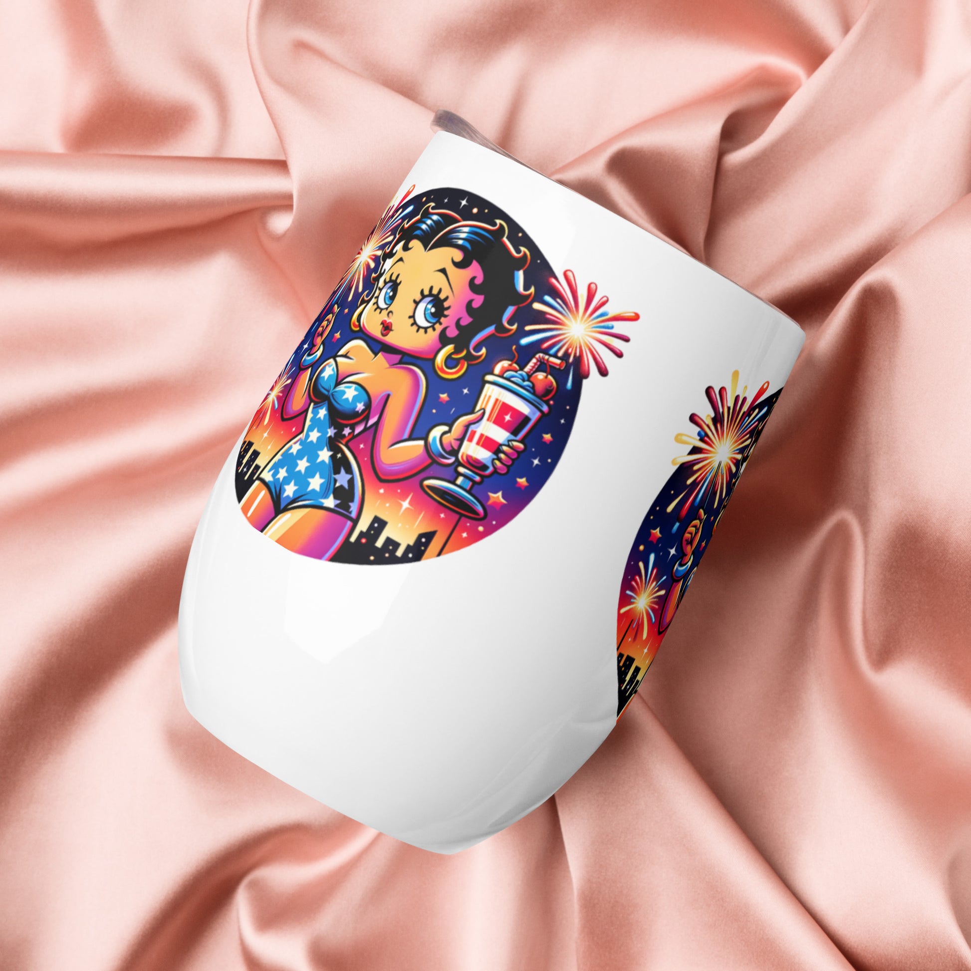 What’s an outdoor party without a wine tumbler to keep a drink fresh and at the right temperature? Forget breakable glasses—give this uniquely shaped wine tumbler a chance. Celebrate in style with this charming wine tumbler featuring Betty Boop raising a toast amidst festive fireworks. This tumbler combines vintage flair with modern fun, perfect for sipping your favorite drink, making it an ideal companion for parties, picnics, or cozy nights in. Cheers to good times with Betty Boop!
